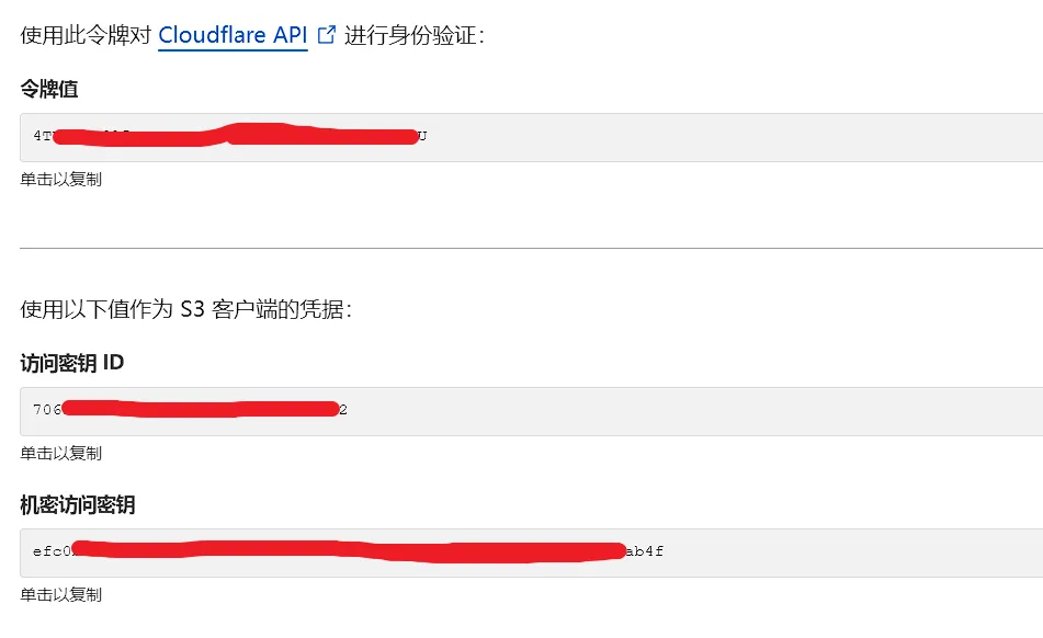 创建完成令牌以后请把 访问密钥 ID 和 机密访问密钥 收藏好,只会显示这一次,以后用的时候就找不到了,记下来以后还能用到。当然,如果没记住的话,以后再创建一个api令牌也是可以的。