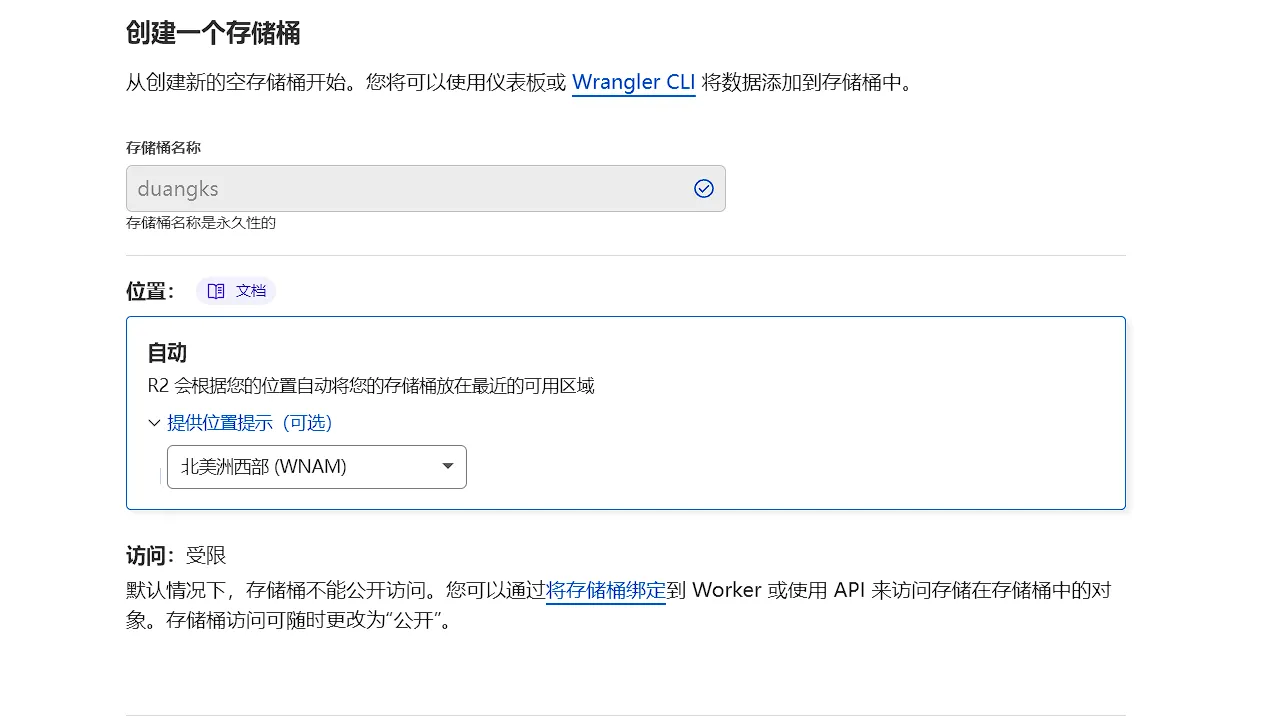 第二步是创建存储桶,可以自己选取位置,不建议无脑选亚太地区,亚太地区虽然近但是国际访问速度受限,我这里选择北美西部。