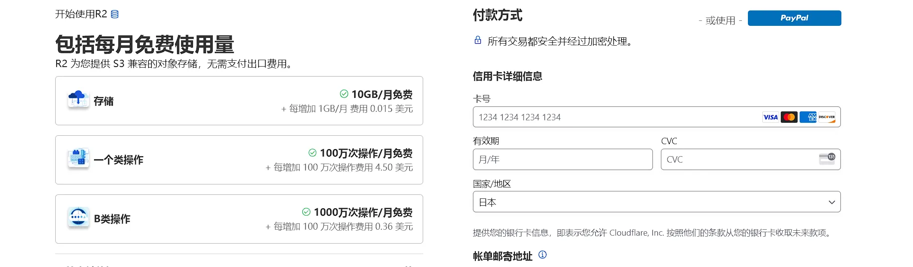 第一步当然是开通R2,侧边栏找到R2然后点击开通。这里可以绑定支持外币支付的卡,或者直接绑定paypal,中国区的paypal也是可以的。