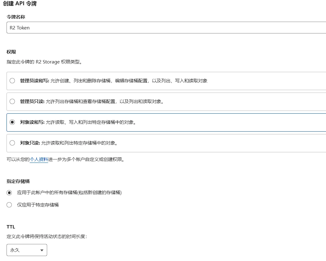 回到R2的概述界面,点击右上角的 管理 R2 API 令牌, 然后点击右上角的创建api令牌,如果要使用picgo进行图片的上传,请记得在权限选项把对象读和写打开,在ttl选项可以设置api令牌的有效期,这里可以选择永久。大概如下图所示。