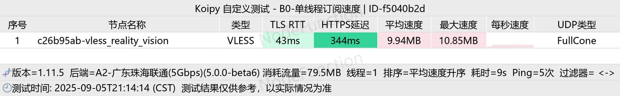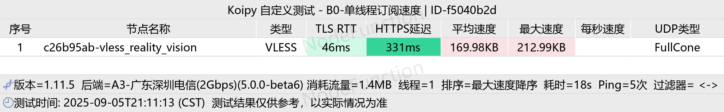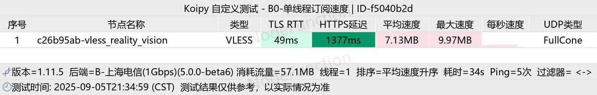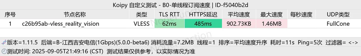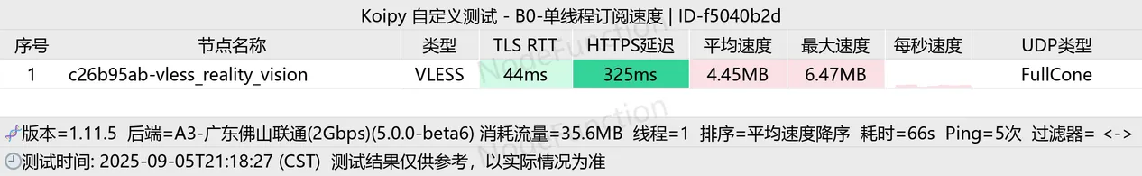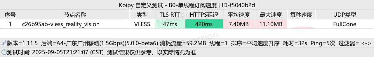 依旧是使用我们常规的vless reality测速,本次是在晚高峰时期测试,很抱歉的是电信宽带这次集体扑街。